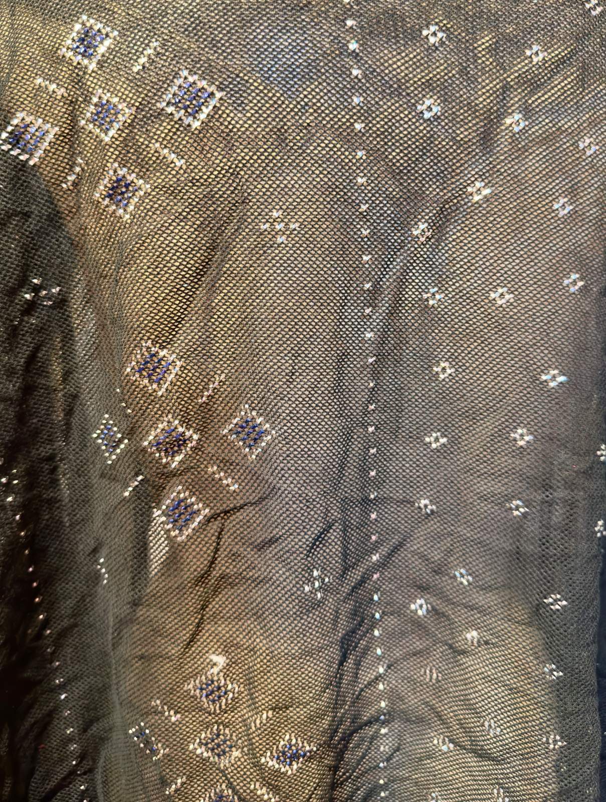 • 黒や濃色のチュール地に、金属片(主に銀や銅の薄片)を手で織り込んで模様を作る。